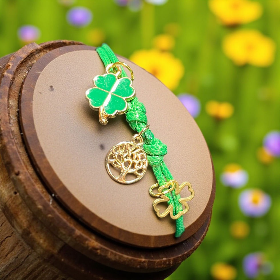 Green & Gold 4-leaf clover & Tree of Life Charm Adjustable Bracelet